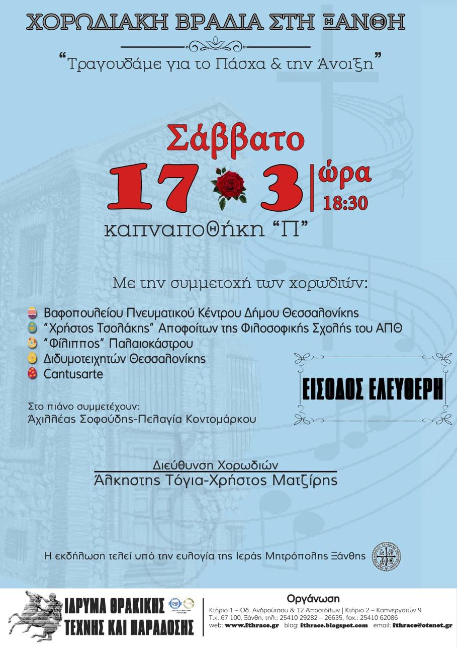 Το Σάββατο 17 Μαρτίου 2018, στις 18:30, το Ίδρυμα Θρακικής Τέχνης και Παράδοσης διοργανώνει χορωδιακή βραδιά αφιερωμένη στο Πάσχα και την άνοιξη, με την συμμετοχή των χορωδιών,