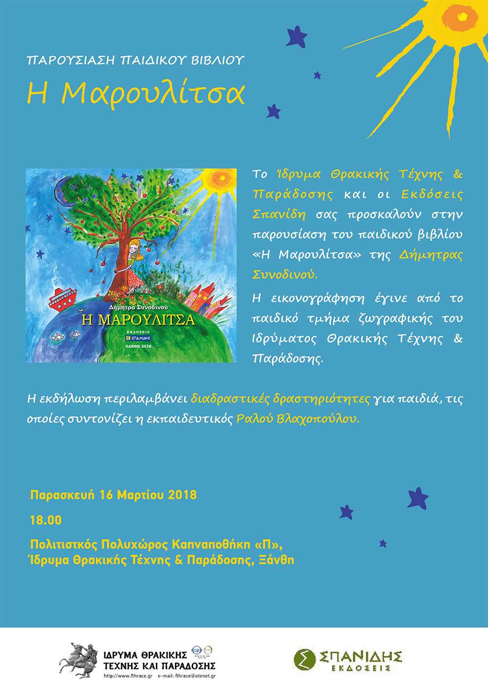Την Παρασκευή 16 Μαρτίου 2018, στις 18:00, το Ίδρυμα Θρακικής Τέχνης & Παράδοσης και οι εκδόσεις «Σπανίδη» διοργανώνουν εκδήλωση για την παρουσίαση του παιδικού βιβλίου «Η Μαρουλίτσα» της Δήμητρας Συνοδινού.
